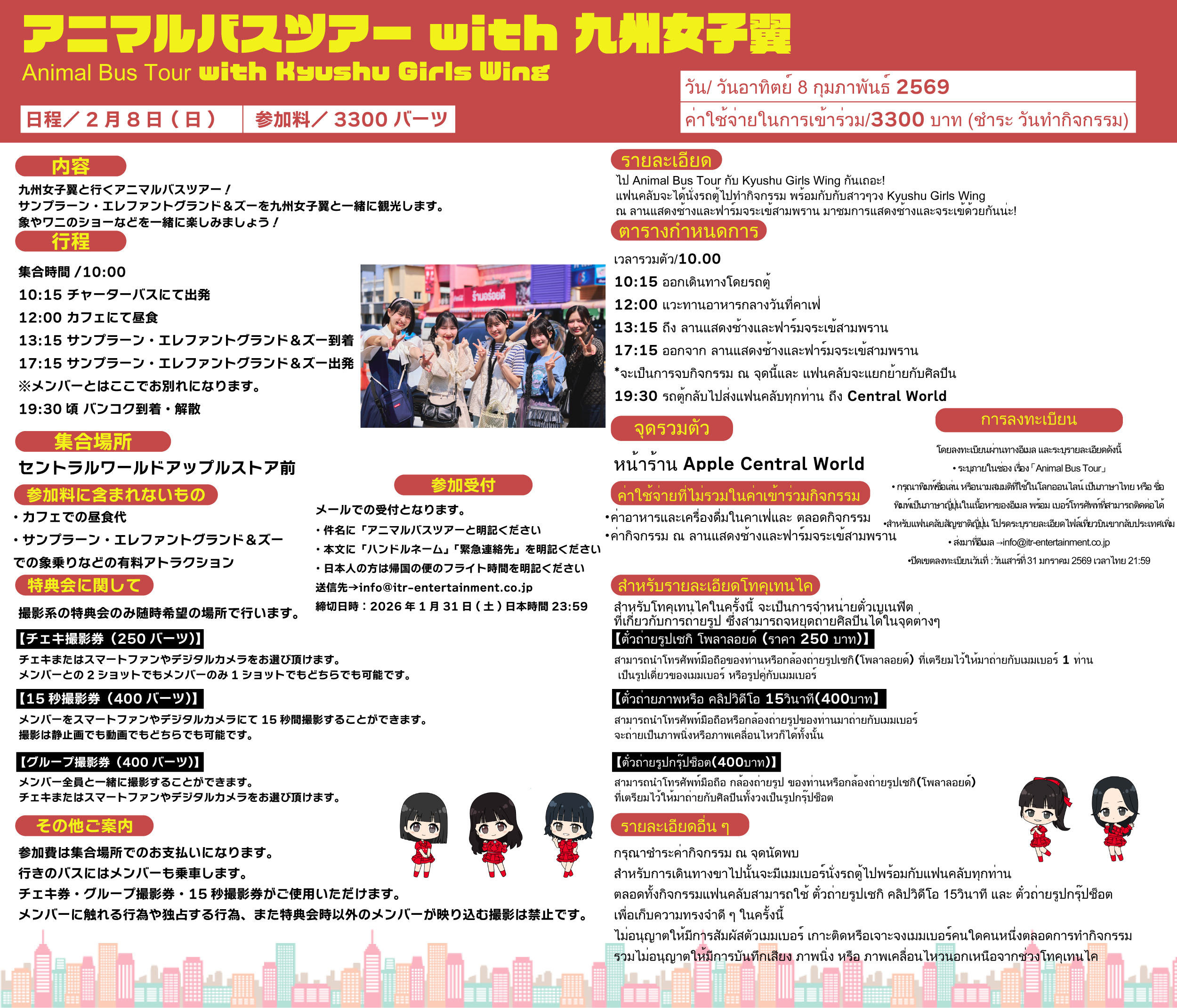 แฟนคลับจะได้นั่งรถตู้ไปทำกิจกรรม พร้อมกับกับสาวๆวง Kyushu Girls Wing ณ ลานแสดงช้างและฟาร์มจระเข้สามพราน